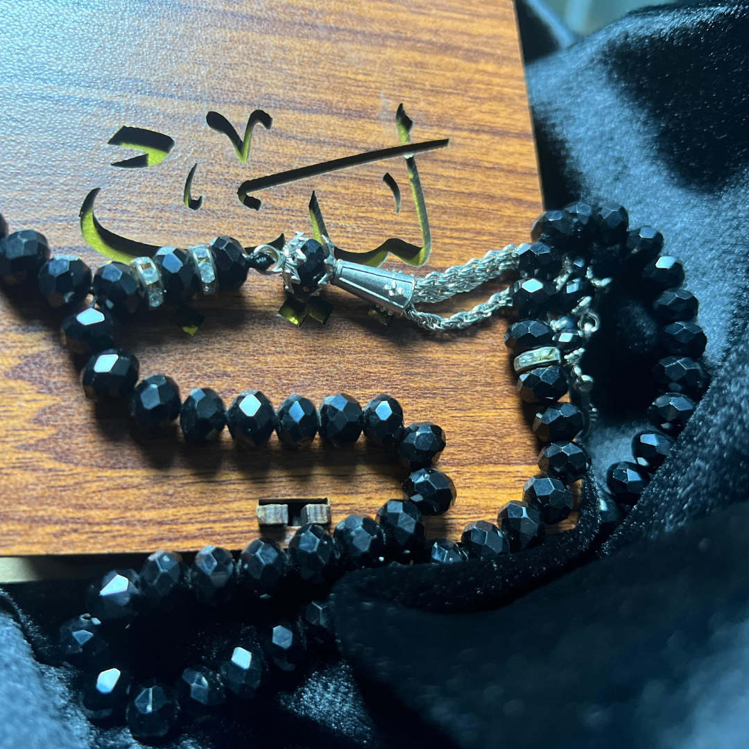 مسبحة كريستالية سوداء راقية مزينة بسلاسل فضية متألقة وزخارف أنيقة. مثالية للعبادات الروحية وتعد إضافة أنيقة كقطعة تذكارية مميزة.